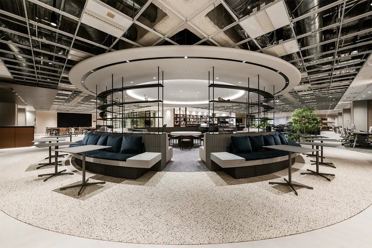 L字型のフロア形状の結節点に設けた、円形のシンボリックなエリア。シームレスで途切れのない「円」という形そのものが、多様な価値観やつながり、一体感を象徴し、テーマである「豊かさ」を発信しています。社員の活動やつながりを温かく包み込む場所として、イタリア語で「家、家庭、故郷」という意味をもつCASAをエリア名に採用しています。