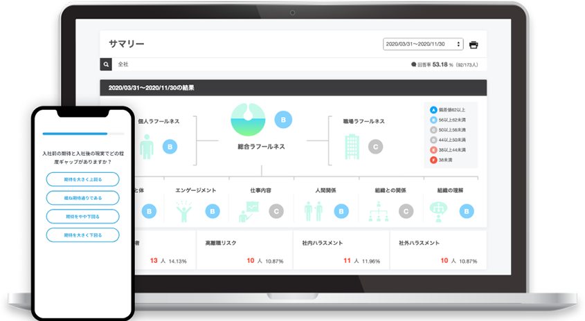 社員の心身の健康状態やエンゲージメントを把握することができます。