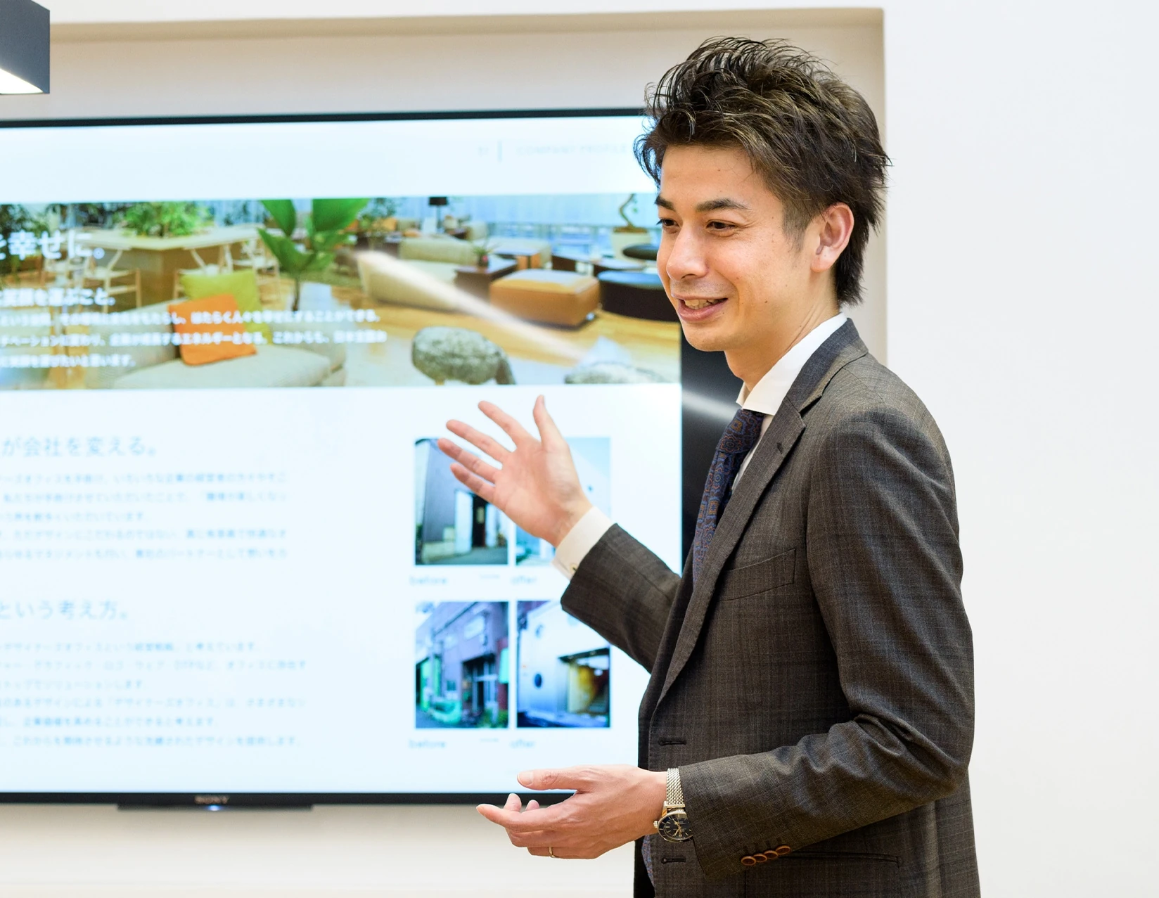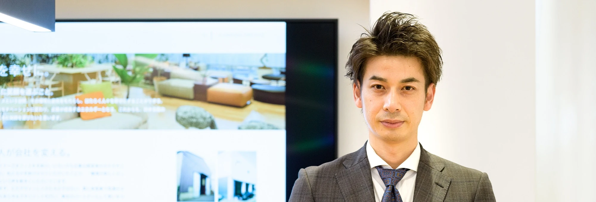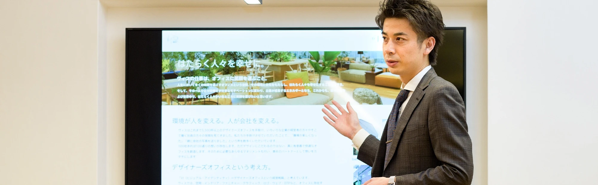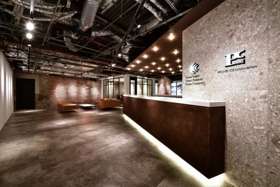 入社2年目の春に初めてデザイナーズオフィス案件に携わらせていただきました。本件は、オフィス空間だけではなく、名刺やパンフなどのグラフィックも一新させていただきました。お客様の想いをヒアリングして一方的にこちらから提案するのではなく、お客様も一緒にアイデアを出していただき、本当にその会社にとっての”らしさ”を表現することができたのではないかと思います。抽象的な仕事であるからこそ、お客様と二人三脚で正解を探っていくことがこの仕事の一番のオモシロさだと学ばせていただきました。