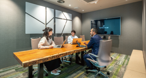 窓際にはベンチシートやソファを設置し、開放的な雰囲気ではたらくことができます。業務のほか、少人数での打ち合わせ、リラックスと多用途に使えます。大型LEDモニターを設置しており、イベントも開催できます。
