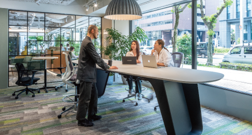 ワークスペース内には、スタンディングで打ち合わせができるスペースを多く用意。立ったままミーティングをすることで、スピーディな会議進行と自由闊達な意見交換を促進します。