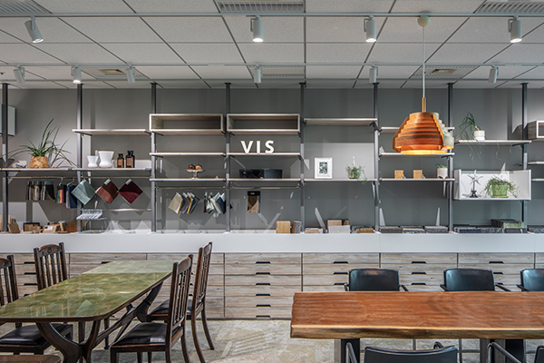 マテリアルの管理や選定をするエリア。床材や壁紙などのマテリアルを共有する棚を設置しており、一箇所に集めることで効率的な管理ができ、資源の削減を図ることも可能です。新製品やトレンドを早く取り入れ、情報共有もしやすい工夫をしています。