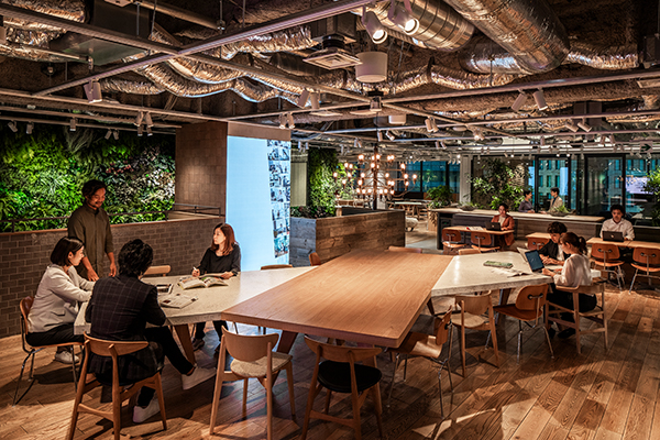 エントランス正面の人が集まるエリア。中央のビッグテーブルは大人数の会議にも、少人数での業務にも使用可能です。柱型LEDビジョンは、LEDが柱に沿って直角に設置されており、視差効果を利用した立体的なコンテンツなど、平面モニターと比較して多彩な演出が可能。壁面緑化や各種ソファなど、多様な体験ができるエリアです。
