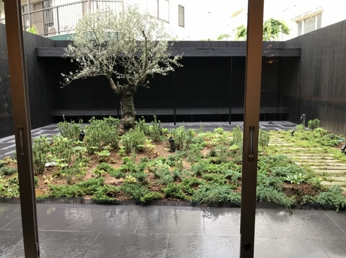 イートインのカフェの奥には、中庭がありました。千駄ヶ谷の空間を贅沢に使った中庭です。この日はあいにく雨だったので、外に出ることはできなかったのですが、シンボルとなる木とその奥にある縁側のようなベンチ。ここもひとつ、寛ぎの場となるでしょう。