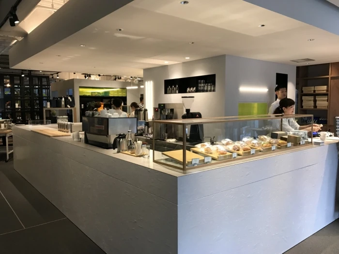 手前にはホワイトを基調にシンプルに仕上げられたカウンターのカフェが。