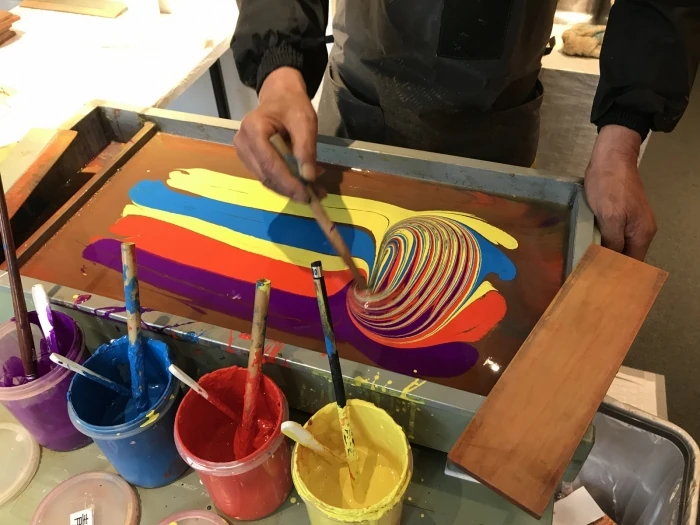 数種類の顔料を布海苔という液面に落とし、針やくしを使って細かな文様を描きます。この模様を描き出す場面は、とてもスピーディかつ鮮やかで、職人としての技術が大いに発揮されるものでした。