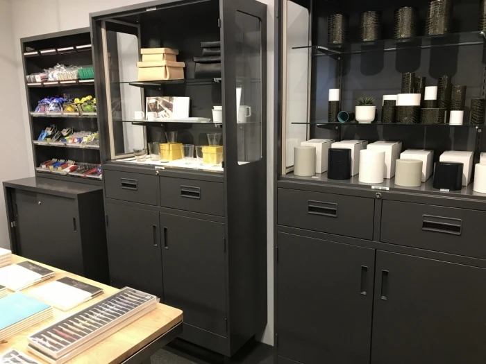 文房具などをディスプレイしている家具に、もともとコクヨが扱っているスチール書庫で薬品などを保管しておくための薬品庫が使われていたり、