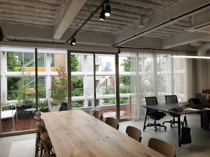 大きな窓からの採光は、照明の灯りがいらないほどに明るく、晴れていればテラスで気持ちよくリフレッシュができるオフィスにデザインされていました。
