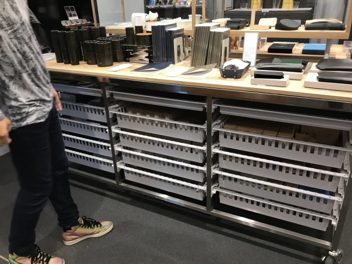 その他にも、普段は大型スーパーや量販店、文房具店などでプラスチックのパッケージに入れられて売られている文房具が、この「THINK OF THINGS」に合わせてオシャレにディスプレイされ、コクヨの社員さん自身が、自社にこんな製品があったのかと気付かされるぐらい、また違った顔を見せている文房具たちが並んでいます。