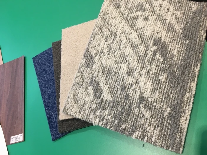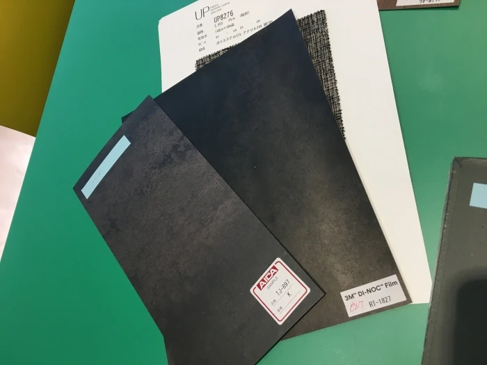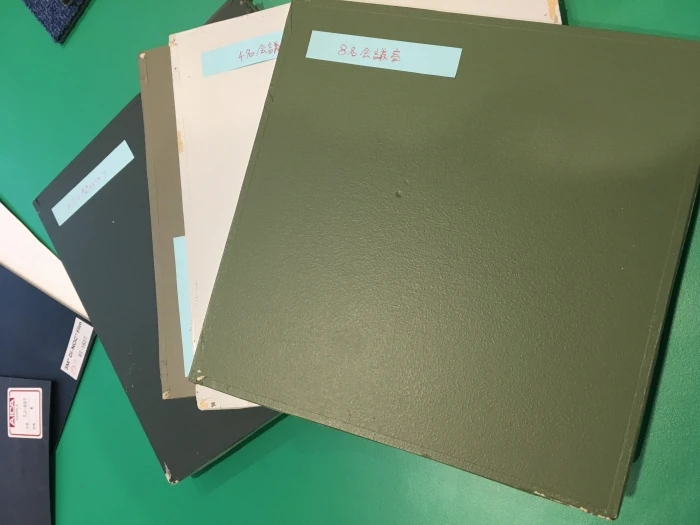 上から順番に、受付カウンターの素材、扉に張るシートの素材、ソファの生地です。