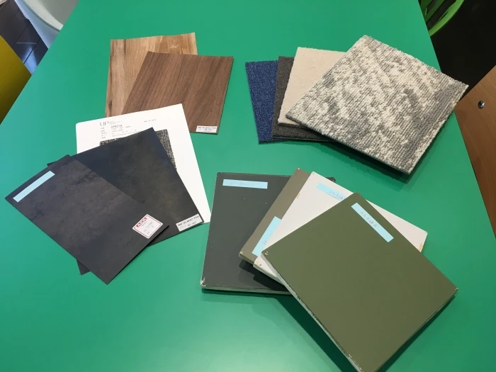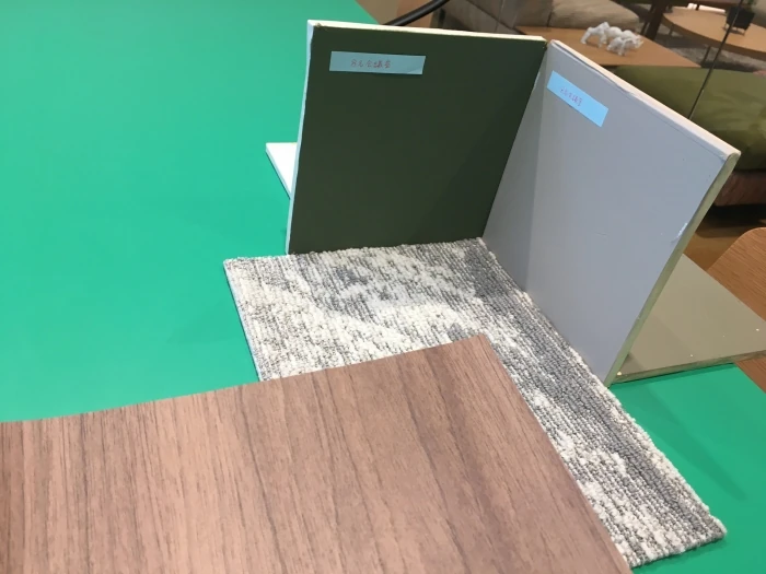 床材から、壁紙素材、塗装サンプル、受付カウンターの素材まで