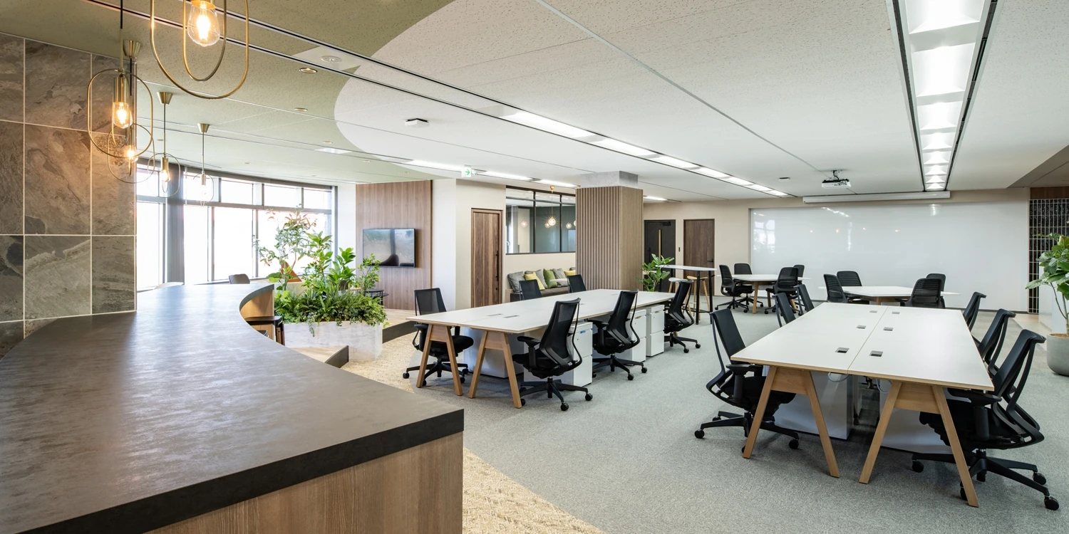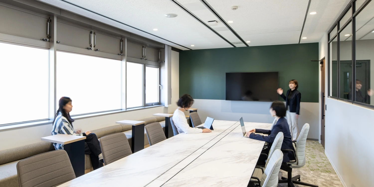 企業成長に柔軟に対応するレイアウト。落ち着きと明るさのあるオフィス空間