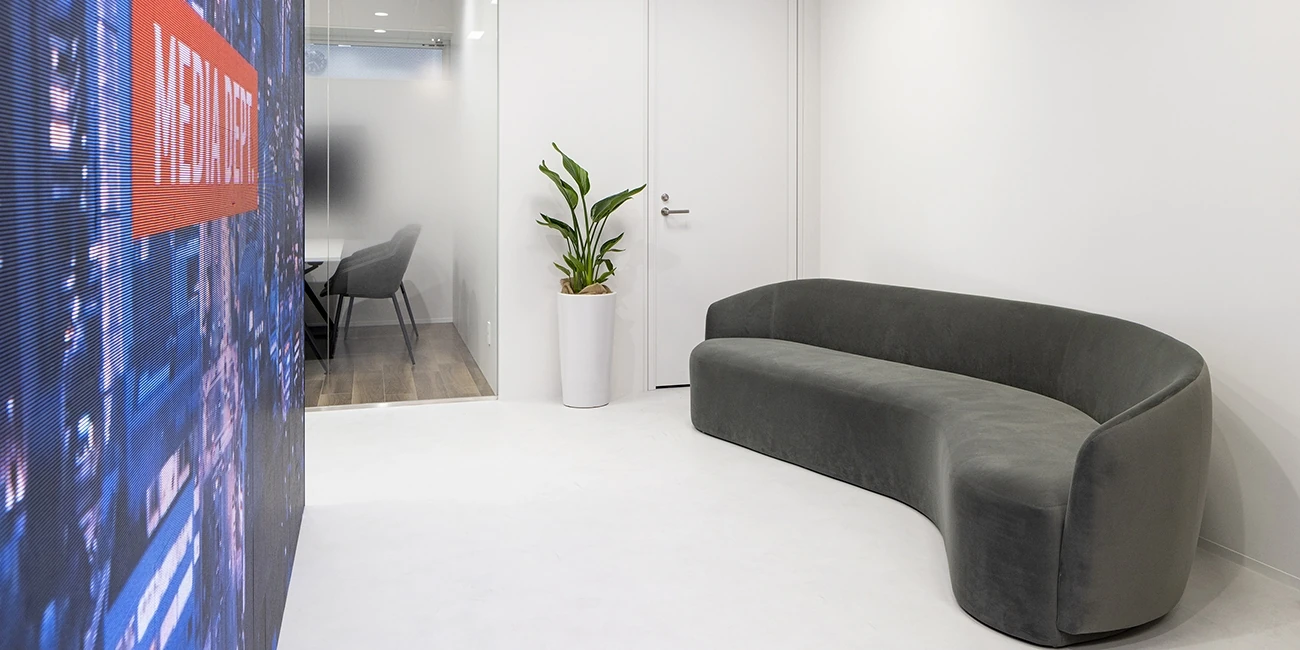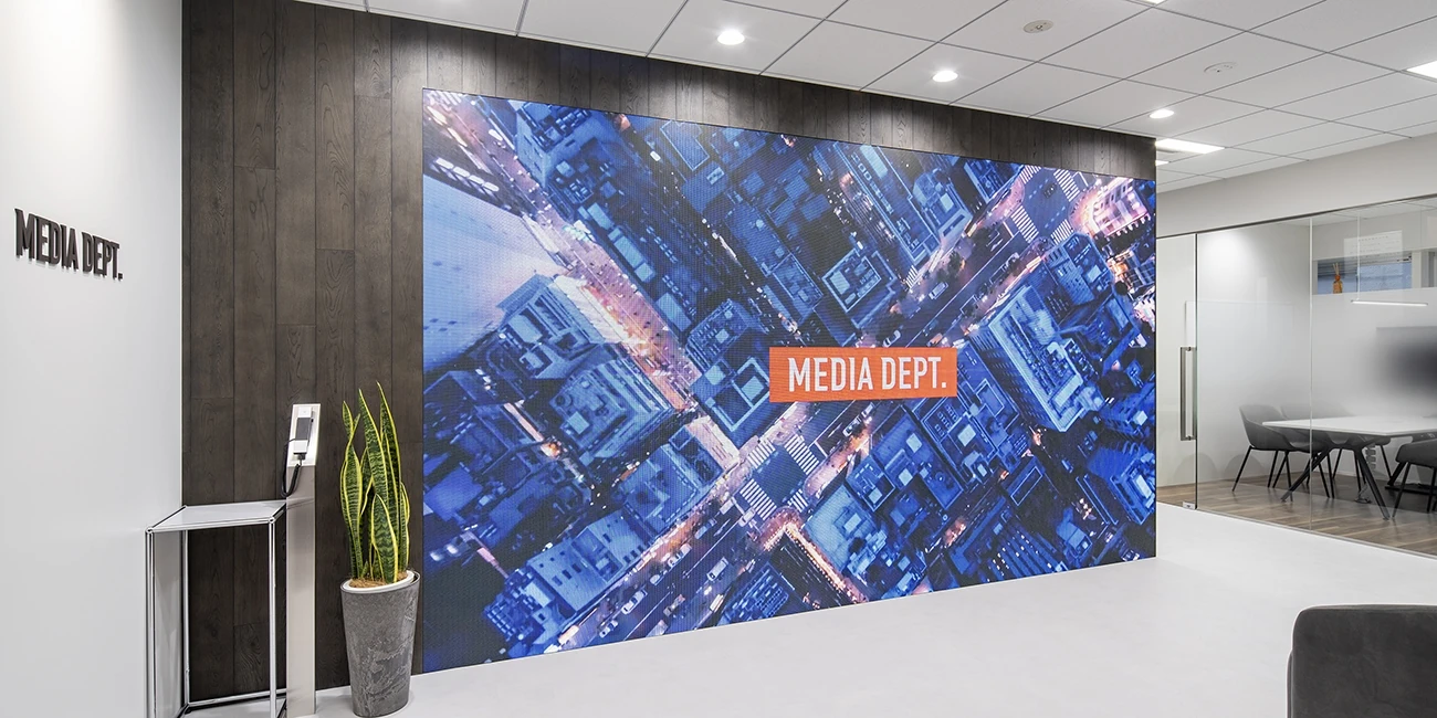 社員エンゲージメント・モチベーション向上を目的としたオフィス移転プロジェクト。自社のサービスに誇りを持ち社員の皆さまがモチベーション高くはたらくことを大切にする企業様で、自社サービスを印象づけるデザインを随所に施しています。エントランスには大型LEDビジョンを設置し、訪れる方はメディアデプト様のダイナミックなメディアサービスを直に感じられます。執務エリアの近くにリフレッシュスペースをレイアウトし中央にプロジェクターを設置することで、業務だけでなく社内イベントにも利用できる多用途なエリアとしました。インテリアはアーバンで洗練された印象になるよう統一してデザインし、大都会の景観づくりも担う企業のアイデンティティーを表現しました。