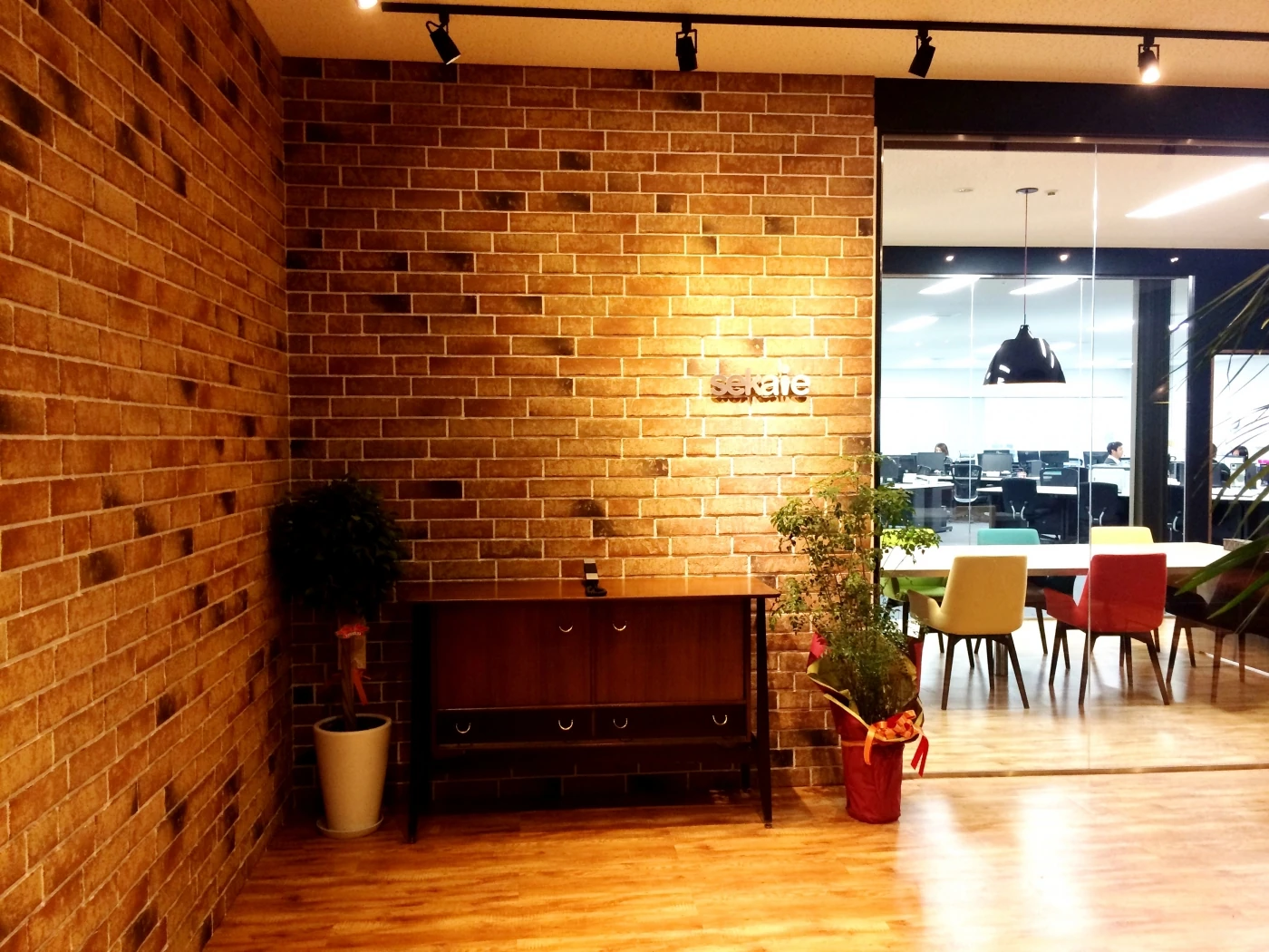 オフィス空間をデザインすることで、より良い人材を集めたい。新しい才能を発掘したい。そんな思いのもと、今回のプロジェクトが始動しました。コンセプトは「会社と感じさせないオフィス」。エントランスの受付台は、1点物のアンティーク家具、壁面は照明効果を最大限発揮できるよう、海外から輸入したブリックタイルを不規則に配置しています。床材もアンティーク風の木目の床材を用いることで、アンティークカフェの様なエントランス空間に仕上がりました。会議室は、配線を見せないように造作した古木風の会議テーブルと、一つ一つのチェアの張地の色を変え、壁面を一面ホワイトボード仕様にすることで、活発な意見が出る有意義な会議を演出する空間となりました。