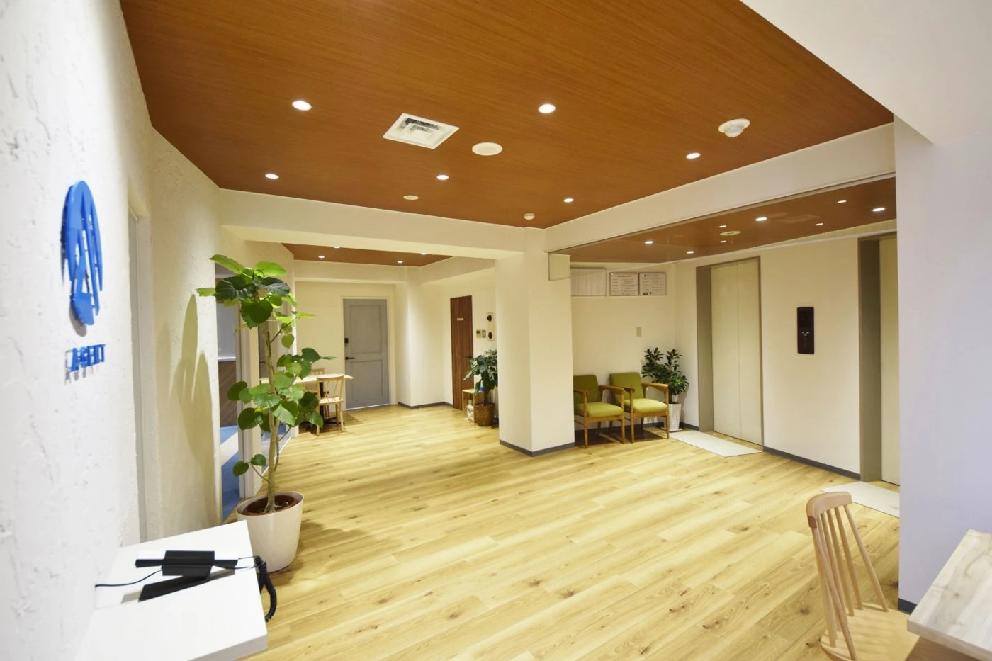 「HOME」というコンセプトのもと、エントランスは初めてご来社された方でも落ち着ける空間となるよう床と天井を木目調にし、家具類も木目に統一しました。