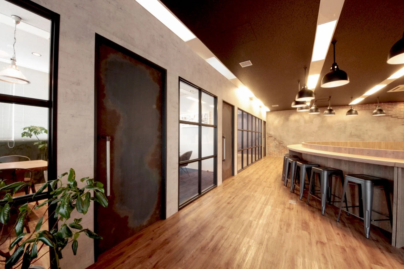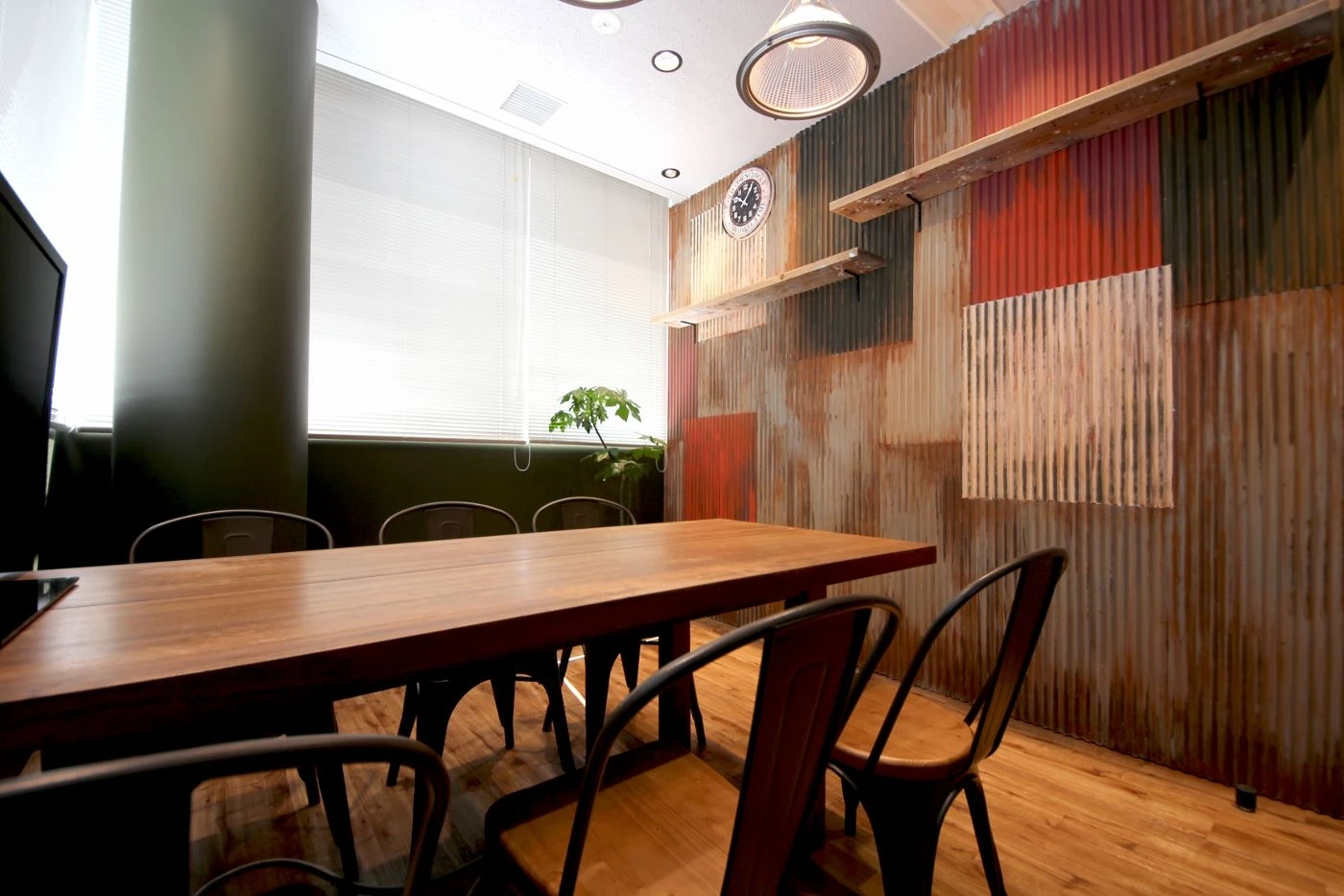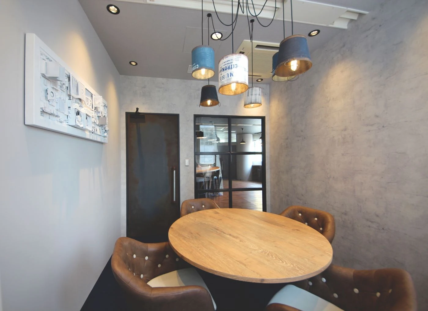 デザインコンセプトを守りながら会議室ごとにデザインを変え、煉瓦壁にエイジング塗装を施した部屋、壁にトタンを使用しデザイン塗装した部屋、照明にビンテージ風の缶を使用した部屋など、細部までこだわり空間を構成。