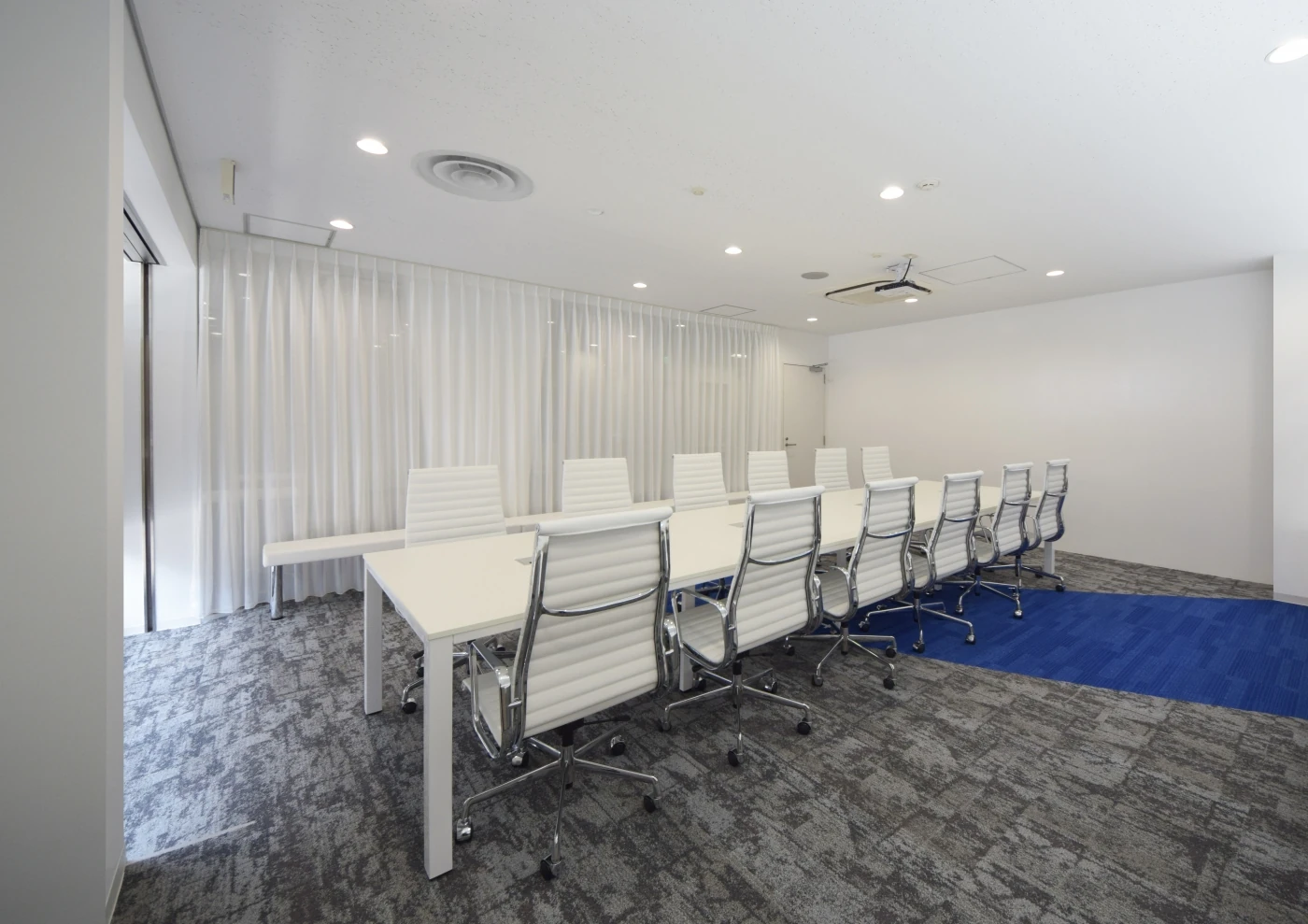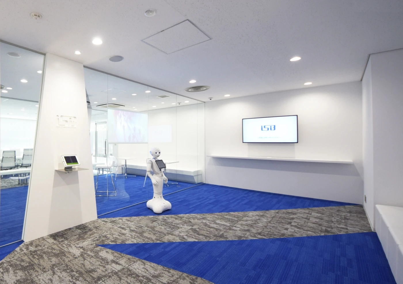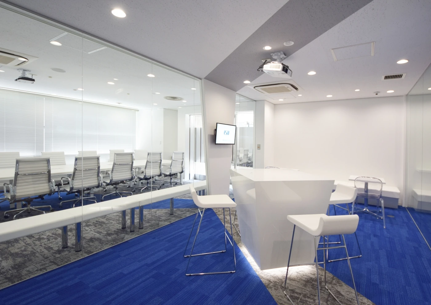 コンセプトを『START LOCATION』と掲げ、メインエントランス兼来客エリアとして5つの会議室を設けました。別フロアにワークスペースがあるため、受付をしてからお客様をご案内するまでの時間はアイ・エス・ビー様を感じて頂けるように、コーポレートカラーのブルーと清潔感のあるホワイトを基調とし、更にコーポレートムービーをガラスやモニターに投影する演出を取り入れました。エントランス間仕切りをガラスに、そして床にダイナミックなデザインを入れることによって、未来へと繋がっていくような空間全体の広がりを感じてもらえるようにしています。各会議室に関しては、毎回訪れる度に違う雰囲気を堪能し楽しんでいただけるよう、チェアの種類やクロスの柄を変えています。