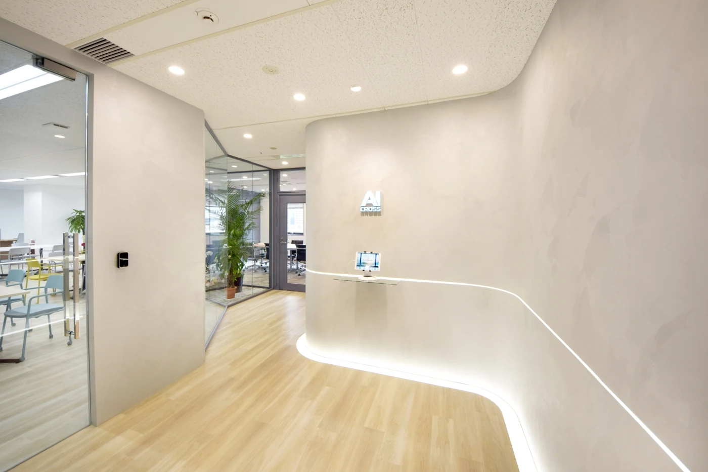 大幅な事業拡大に伴う人員の増加を見据えるとともに、フリーアドレス並びにリモートワーク等の多様なワークスタイルの変化に対応できるオフィスで業務の効率化を図るご移転プロジェクトでした。エントランスは壁と床下に間接照明を用意し、存在感を演出しております。リフレッシュスペースは柔らかい雰囲気を演出するのに木目調を使いつつ、ガラス壁を取り入れることでシャープな印象に仕上げております。ワークスペースもコーポレートカラーである青と白のコントランスにより、スタイリッシュな印象を抱かせることのできるオフィスとなっております。