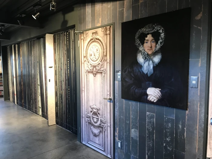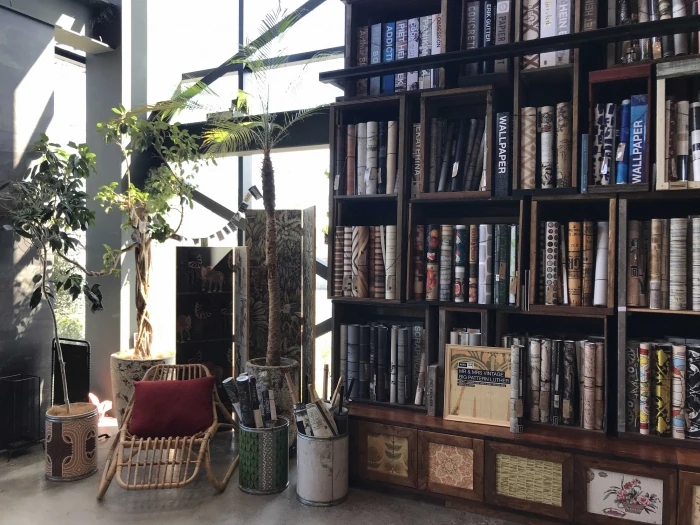 壁際にはロール状に巻かれた壁紙や、商品カタログがズラリ!