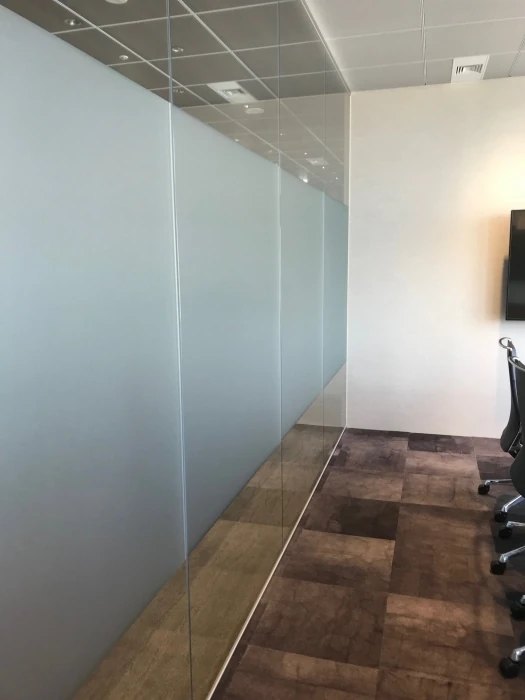 他にも、曇りガラスのシートをデザインカットして、会社のロゴや理念を打ち出したり、