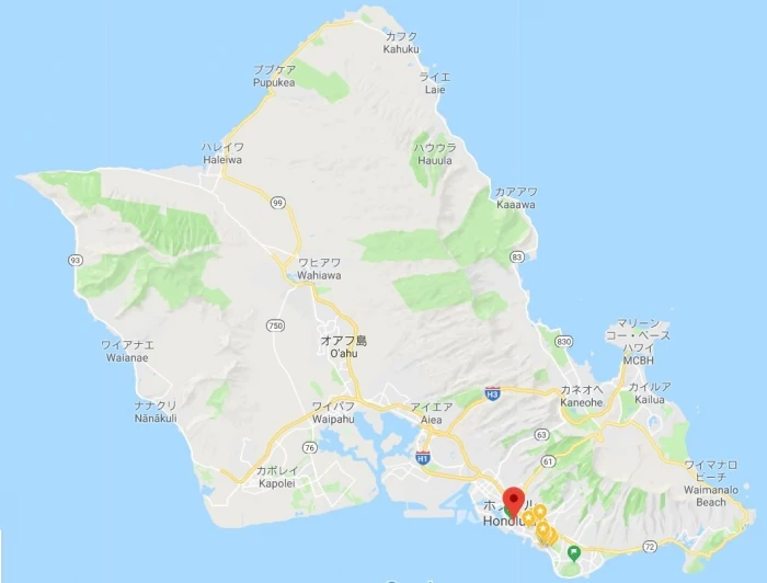 オアフ島のこの辺にあります。ワイキキから徒歩圏内です。