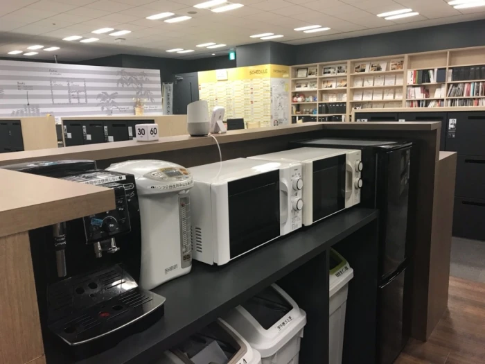 中には冷蔵庫、電子レンジ、ゴミ箱等が備えられていて、