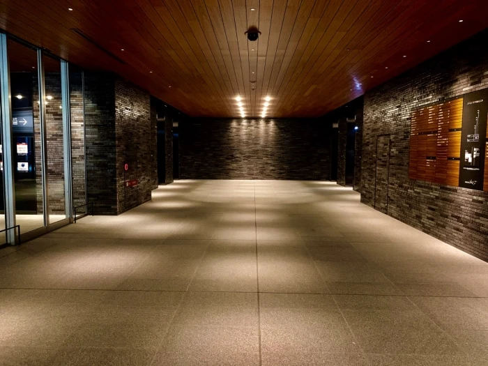 オフィスフロアに続くエレベーターホールは、ダークトーンの細かなタイルと木材で、
