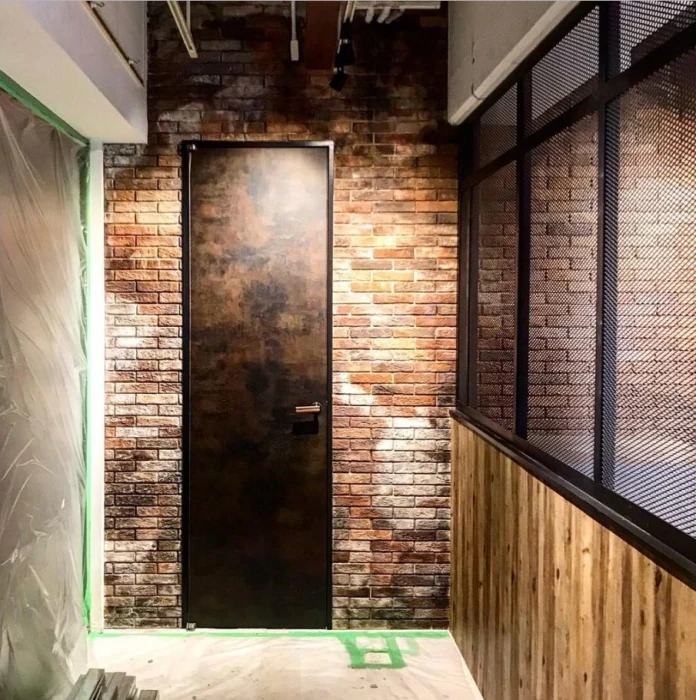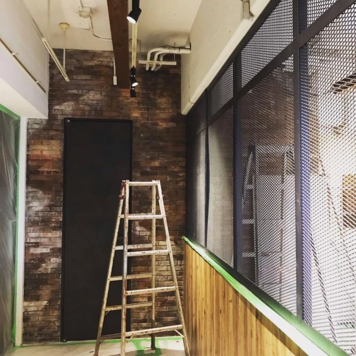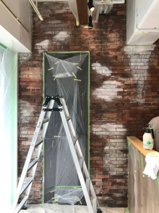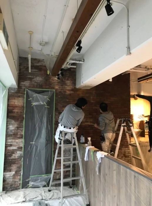 ブルックリン風の赤レンガをイメージしながら、ベースの色を入れながら、レンガタイル一枚一枚に様々な色を重ね、汚しの加工を入れていきます。