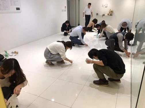 エントランスのタイルをみんなで磨きました。必死です(笑)