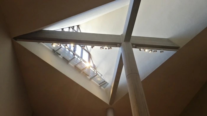 建物内の19世紀ホールと呼ばれる空間では三角形の明かりとりの窓が採用され、スロープを登っていくにつれて空間デザインの変化を楽しむことができます。