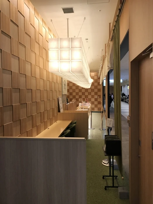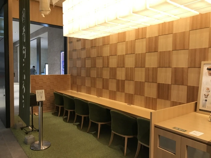 名古屋名物「青柳ういろう」で有名な「青柳総本家」は、2017年4月に全面開業した「JPタワー名古屋」の1階にあり、この店舗はイートインコーナーを併設していて、区画は奥行きがないものの間口がとても広く、14m以上あるとのこと。