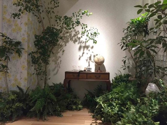 オフィスであることを感じさせない豊富なグリーン、アンティークのチェスト、柄のクロスや、門扉などが特徴的な空間です。
