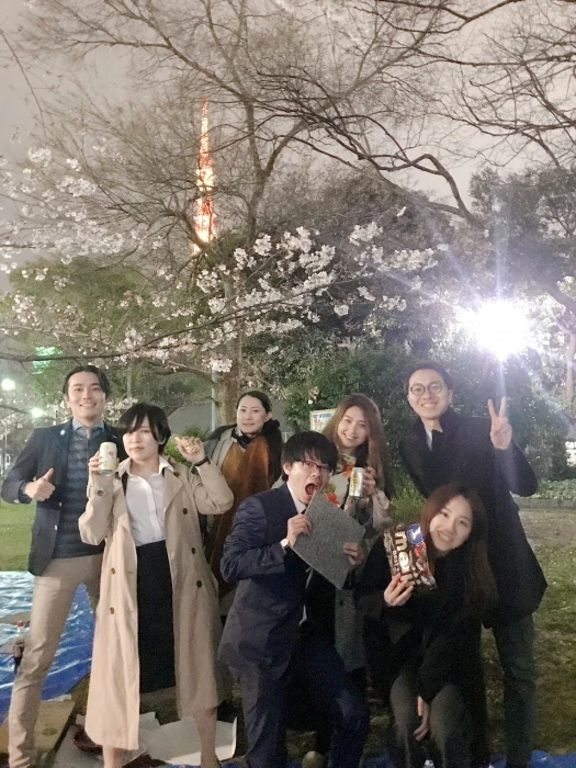 花見をしながら、入社初日の研修を終えた新入社員たちとコミュニケーションを取り、