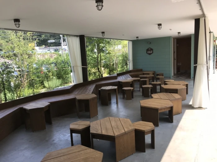 カフェテリアのテーブルやチェアも六角形。