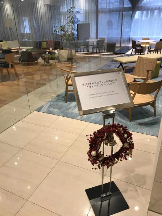 エントランスのすぐ右手、さきほどのツリーの前には、インターンの方への掲示にも、リング状のツリーを飾っています。