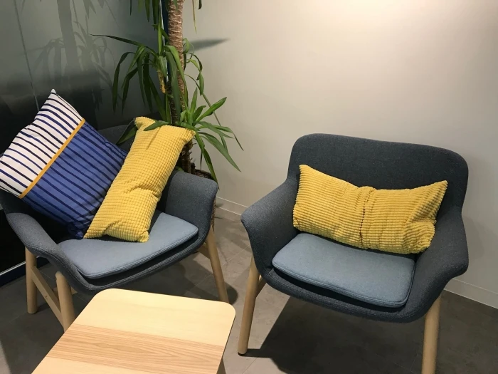 クッションにコーポレートカラーを取り入れて、