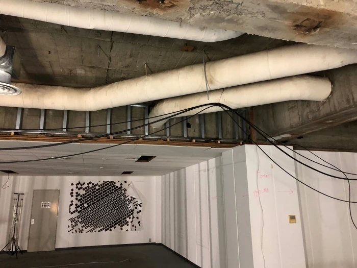 簡単に言うと通常ある天井を取り払ってしまい、ビルの構造体のスラブをそのまま天井仕上げとして使う仕上げをスケルトン天井仕上げと言います。