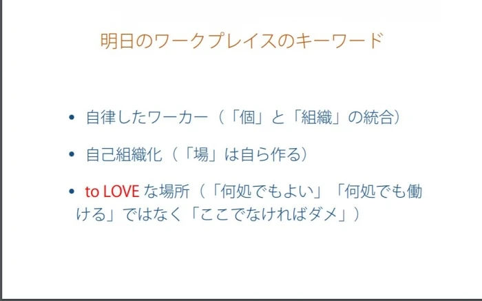 どこがオフィスになるか自己組織化するオフィスの中で、自分の好きな場所「ここで無ければダメ」である、「to love」な場所を創造していくことを説かれています。