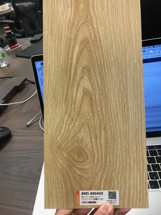 床材の塩ビタイルや壁の素材から家具の貼地に至るまで全ての仕上げ材を選んでいく中で、