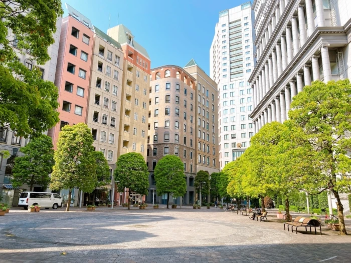 東京オフィスの目の前の広場です。天気が良く緑がとても綺麗です。