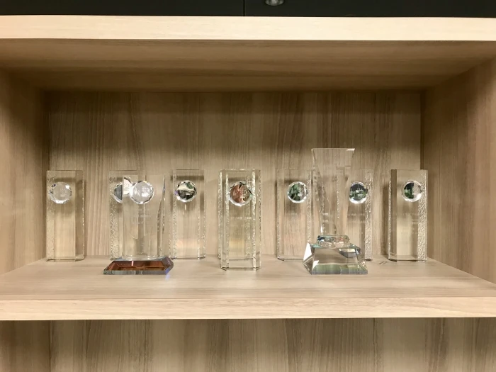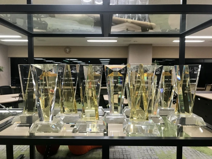大阪オフィスでは、過去のものも含めて30個弱のトロフィーが、