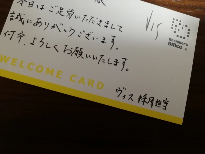 ヴィスでは「サンクスカード」という手書きで感謝のメッセージを書いて気持ちを伝えるカードがあり、クレドにも載っている文化があります。私がヴィスに面接にきた際にもメッセージカード「ウェルカムカード」を頂き驚いた記憶があります。