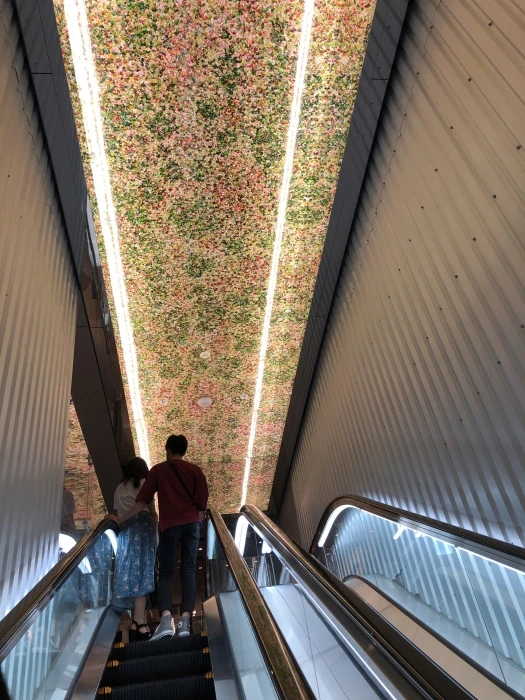 細かい建材だけを見ると冷たい印象ですが、照明に暖色のものを使用されていたり、エスカレーター上の天井にはパークらしい鮮やかな花模様の意匠が施されていたりと、全体的に見事な調和をもたらしています。