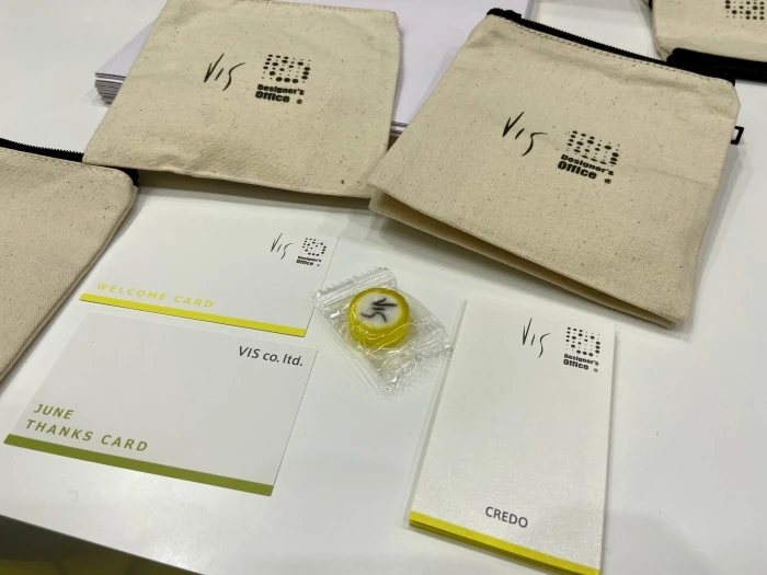 ロゴを印刷したポーチに、ヴィスで実際に使っているクレド、サンクスカード、ウェルカムカード、キャンディなど「ブランディング」を表現するものを入れてお渡ししました。