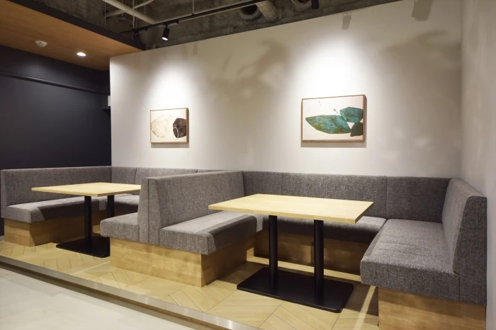 つきあたりには、コの字のファミレス席があります。あえて床を1段上げることで、空間にメリハリを作っています。