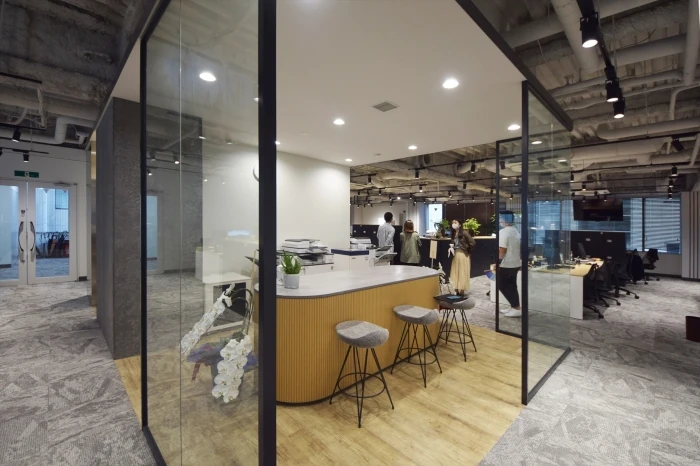 まずは、ワークスペースの中央に位置する作業スペースです。こちらには複合機やシュレッダー、資料をまとめる際に便利な作業台が集約されています。床を貼り換え、ガラス壁を一部作ることにより、デスクエリアとは違った空間を演出しているので、気分を変えて業務に取り組むことができます。