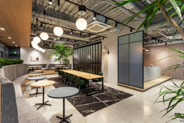 エントランスを少し奥に抜けると、こちらのロングベンチがお出迎えです。異なる2色のテーブルを交互に配置し、ロングベンチの配置に合わせてペンダントライトも設置されています。