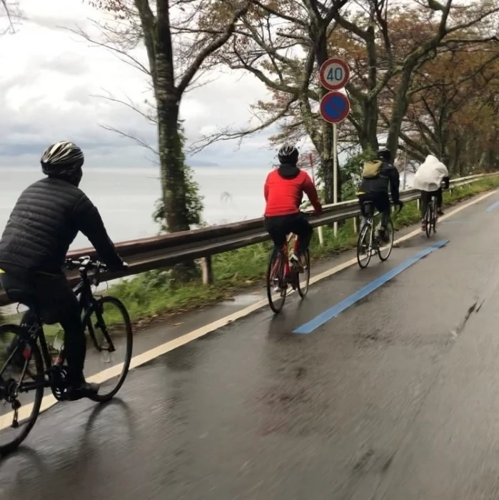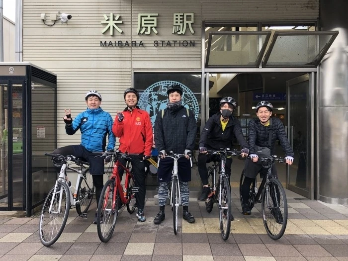 そんな天候にも負けず米原駅にあるサイクルステーションにて記念撮影をし、走り出すメンバー!