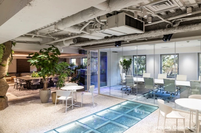 床には川を演出したデザインが施された印象的なオフィススペース