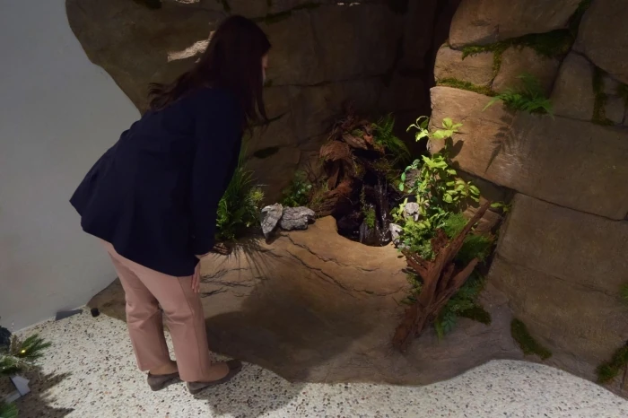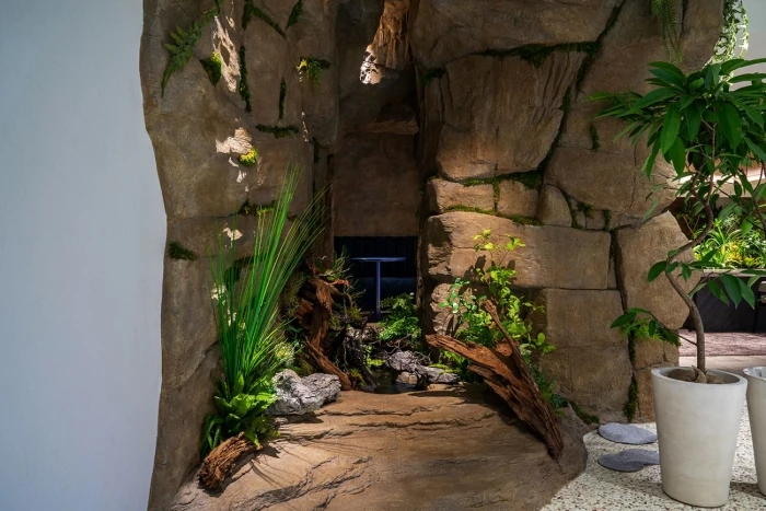 足元には池があり、本物のメダカが気持ち良さそうに泳いでいます。この洞窟は、実際に岩を積んだのではなく、ウレタンフォームというクッションのようなものから形を取って塗装などを加えて表現しています。